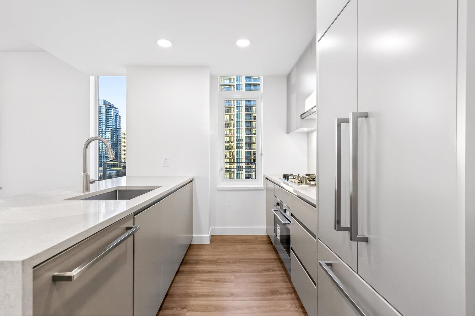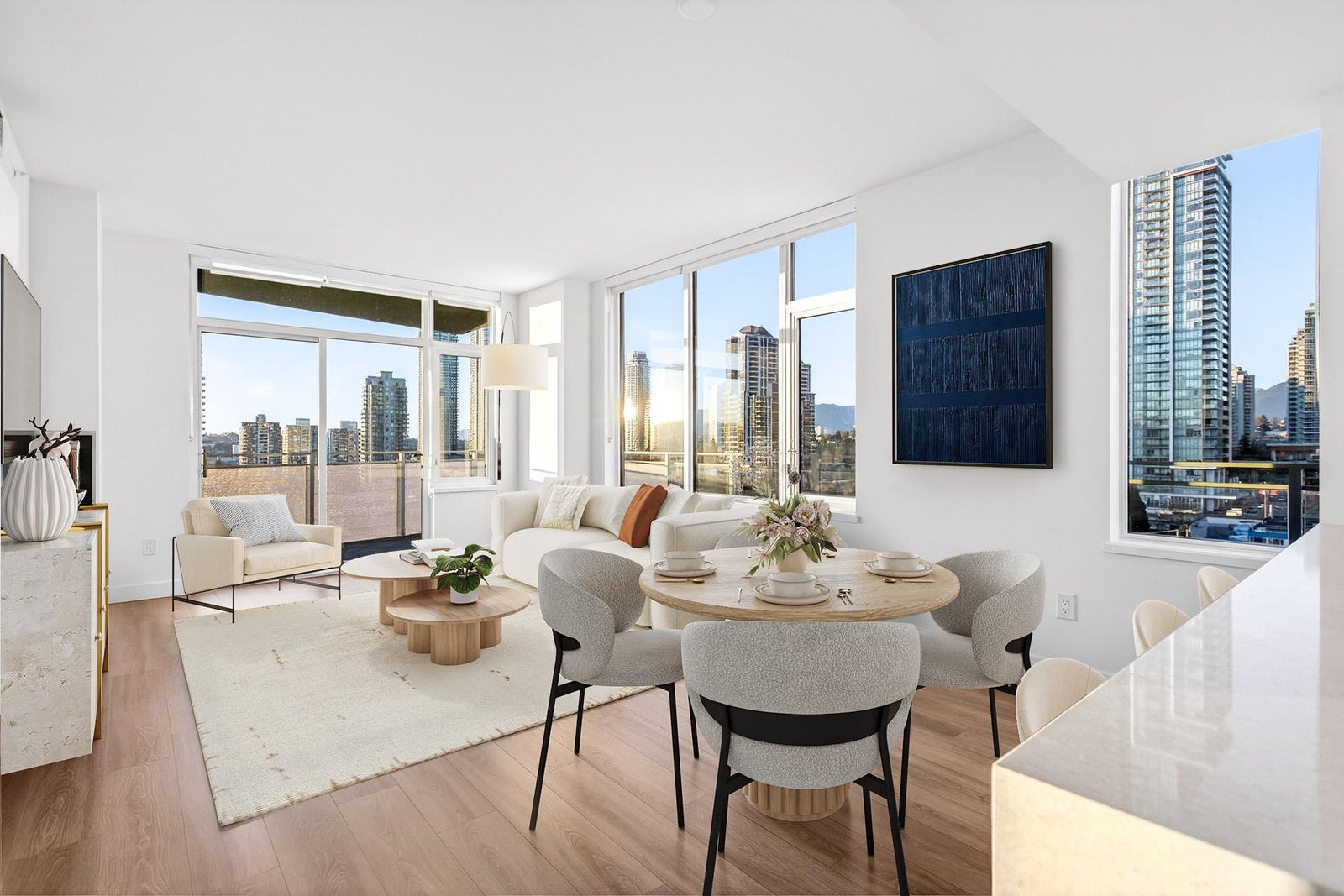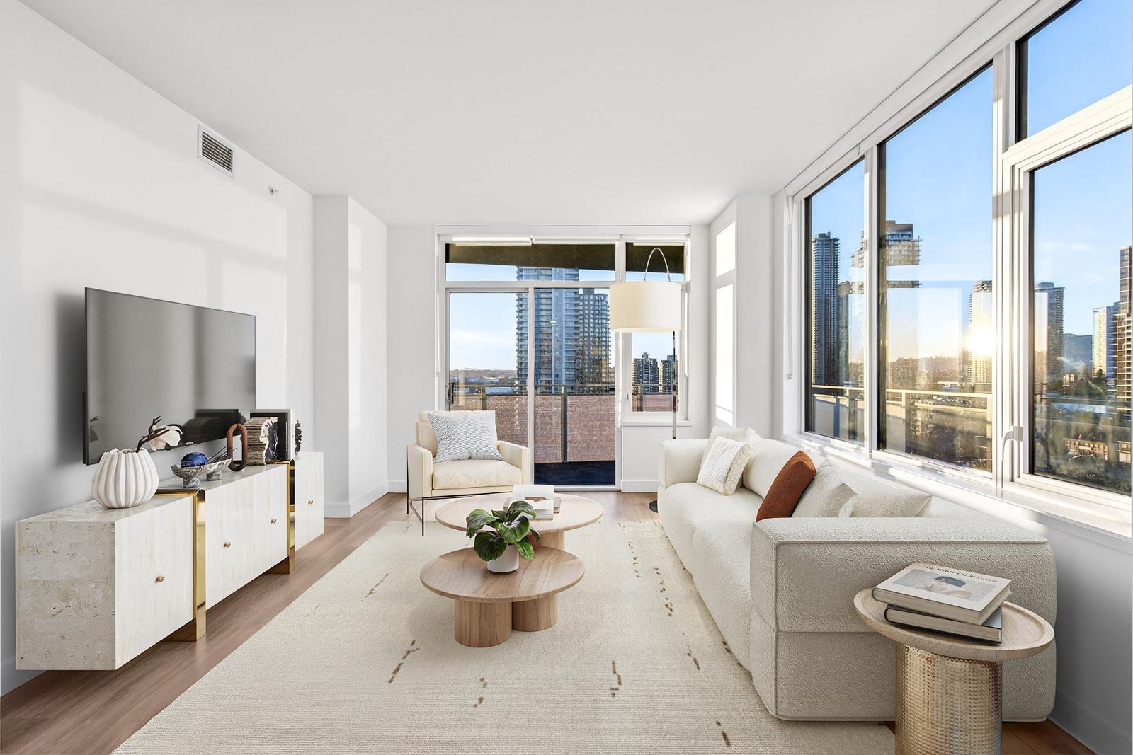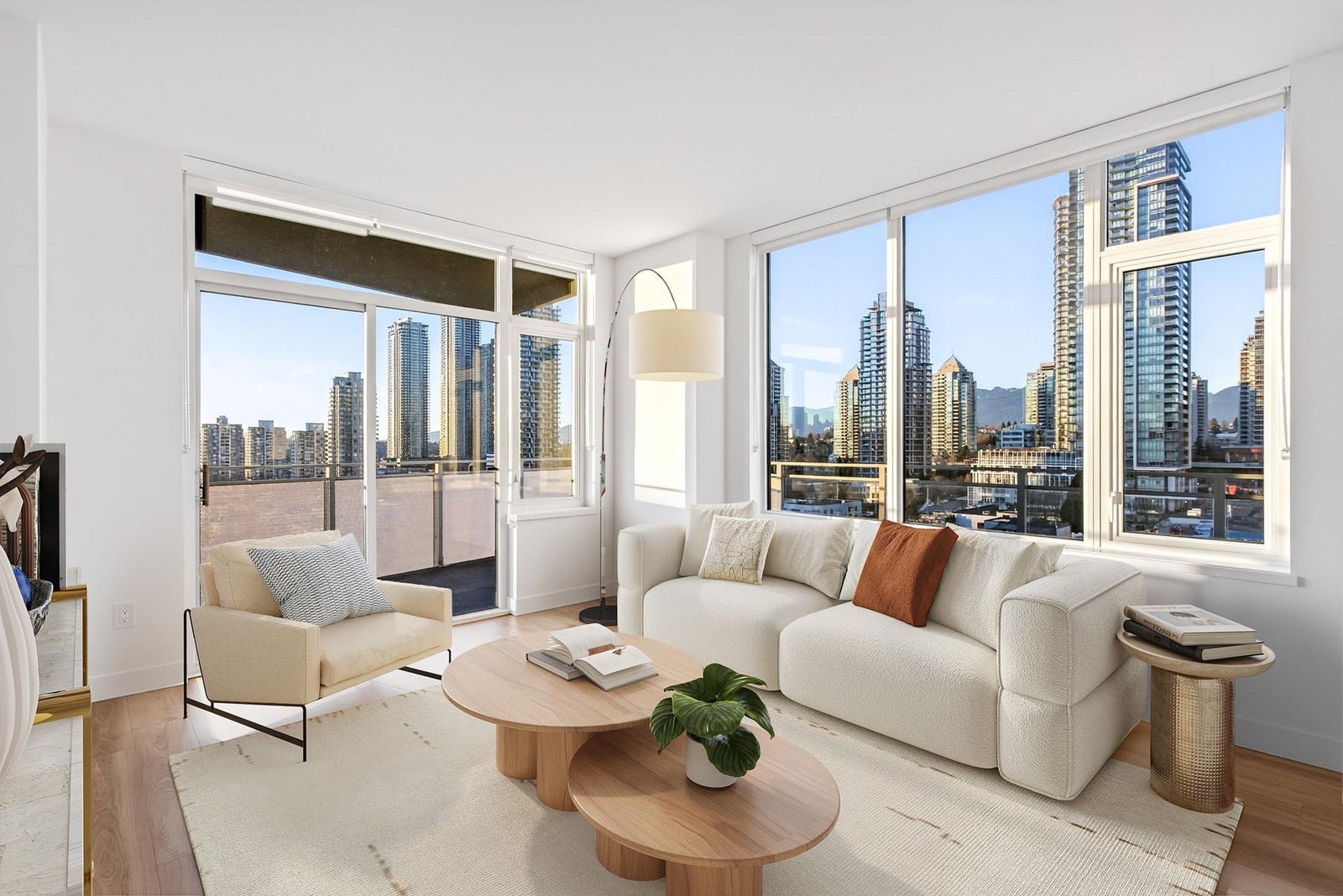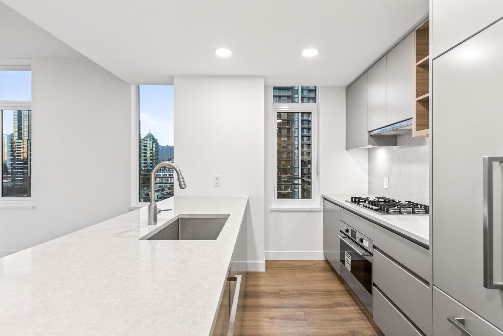 Welcome to this bright and spacious 3 Bed + Den corner home at Alaska by Amacon in the heart of Brentwood. Open-concept living with oversized windows, high ceilings, and beautiful city and mountain views. This well-designed layout features a large 243 sq.ft. wraparound patio for seamless indoor-outdoor living, a modern kitchen with integrated high-end appliances, gas cooktop, soft-close cabinetry, and sleek finishes throughout, plus A/C and heating for year-round comfort. The versatile den is perfect for a home office or extra storage. Enjoy top-tier amenities including a gym, party room, business centre, games room, and outdoor courtyard with BBQ and play area. Comes with 2 parking and a storage locker. Steps to Brentwood Mall, SkyTrain, restaurants and shops.